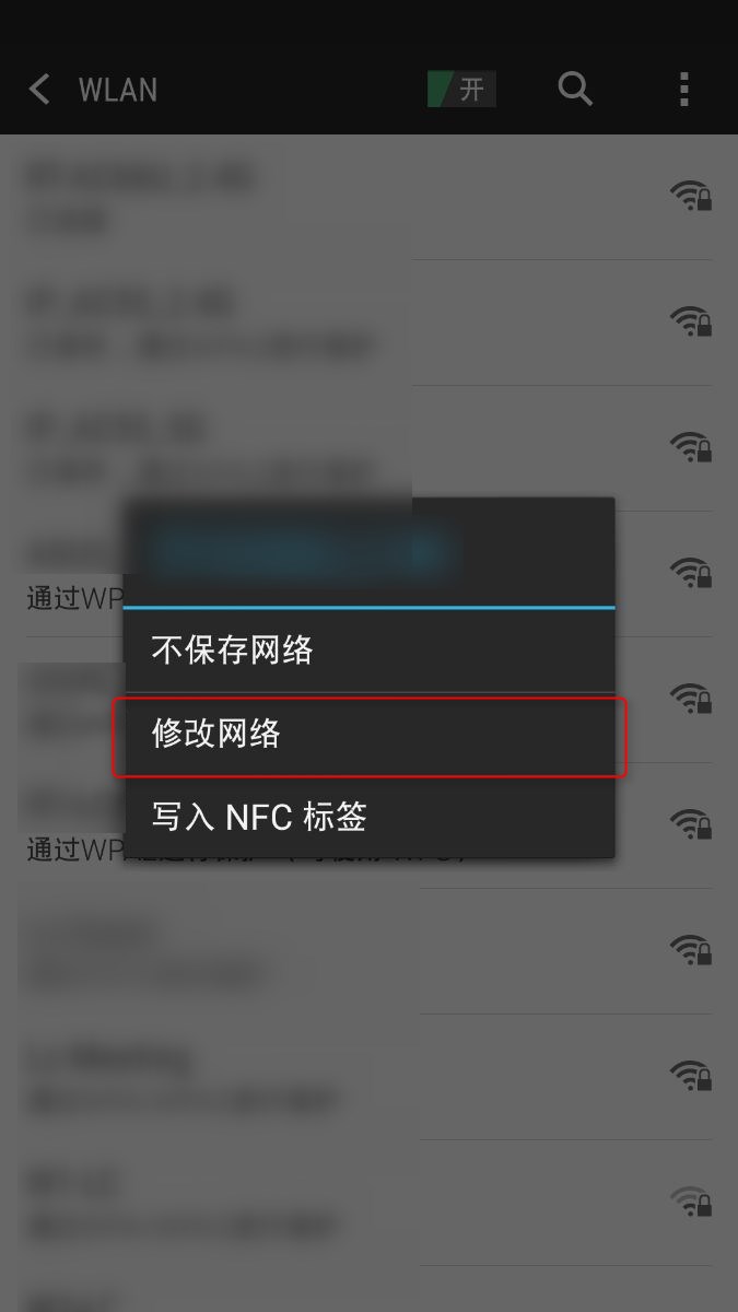3. 在 Wi-Fi 列表选择已连接的 Wi-Fi 名称, 长按之后选择 “ 修改网络