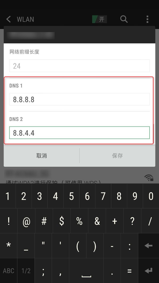 7. 将域名1 和域名2 改成需要更改的 DNS 数值本例子我们使用 8.8.8.8 和 8.8.4.4 , 然后点击 “ 保存 ” 即可